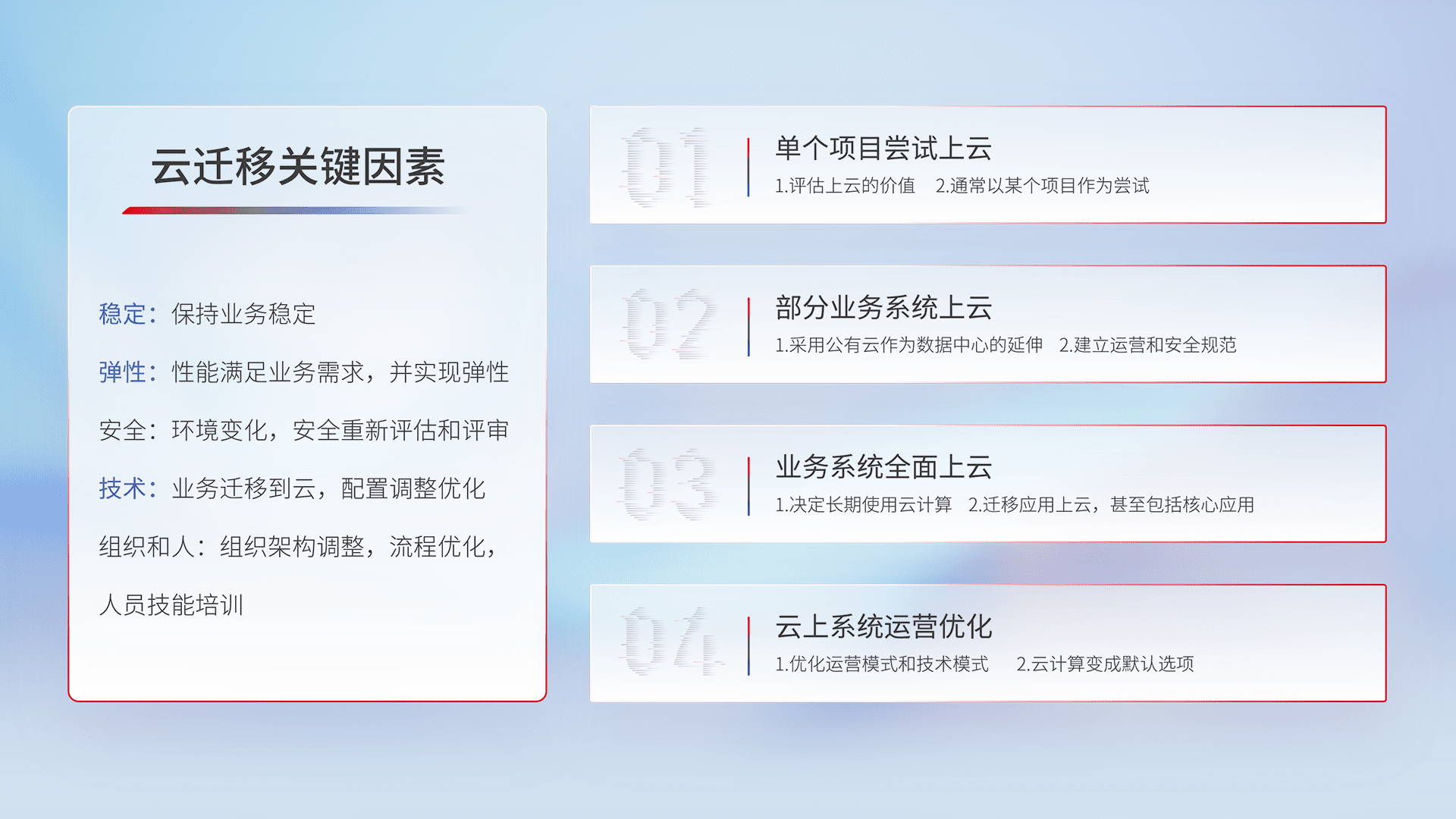 结合实际业务,,,从规划设计、、、云平台选型、、云原生改造、、数据迁移、、集成交付,,,,迁移全过程为客户识别最佳上云路径,,做好风险识别管理,,,,设计网络架构、、身份权限、、、安全审计合规、、、、操作审计、、日志审计、、、、监控告警策略、、、多站点容灾设计等,,,对云上基础设施进行整体规划,,提升IT治理水平,,,,以满足弹性、、、、高可用、、、、高性能的需求。。