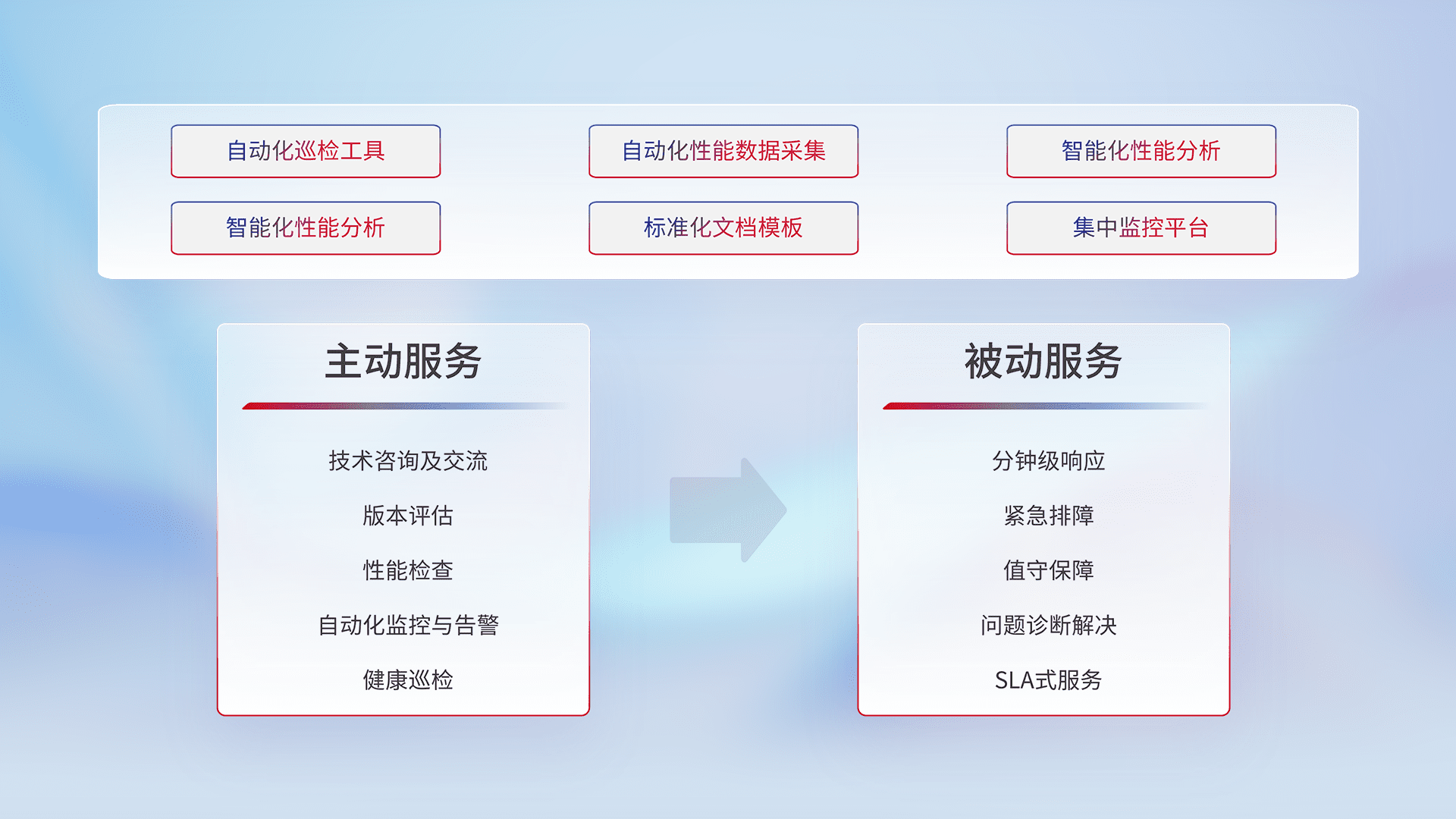 智能化工具和标准化文档,,,保障服务质量,,提供主动服务(包含技术咨询、、版本评估、、性能检查、、自动化监控与告警、、健康巡检)和被动服务包含(分钟级响应、、、、紧急排障、、值守保障、、、问题诊断解决、、SLA服务)。。。。